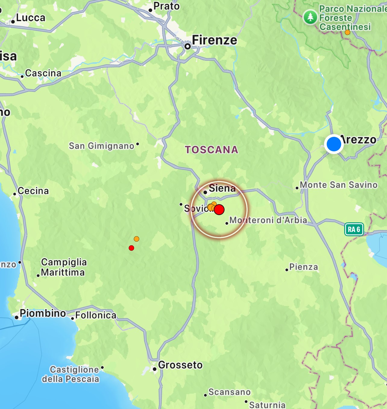 I sismografi hanno registrato soltanto due eventi superiori a magnitudo 2. Entrambi con epicentro Siena, alle 7.25 e alle 7.32: rispettivamente 2.1 e 2.2.