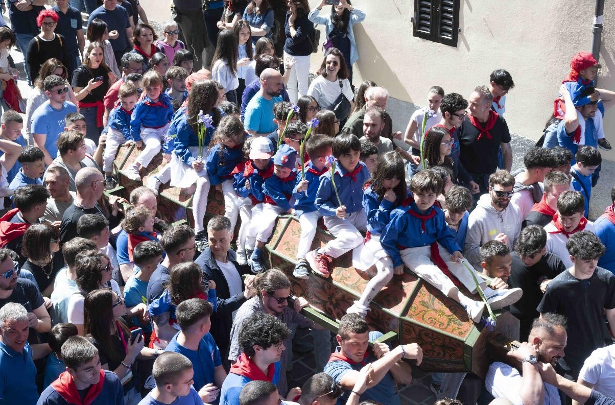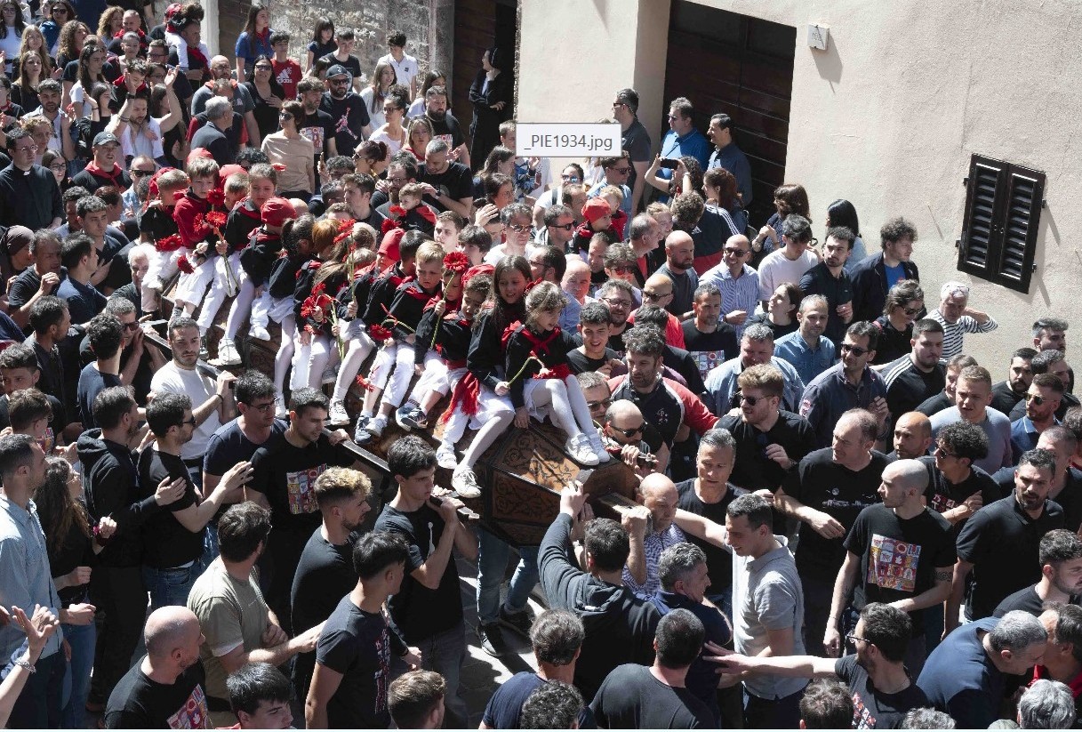 Da questa mattina (4 maggio) alle 11,54 i tre Ceri riposano nell’Arengo Massimo del Palazzo dei Consoli. Ci resteranno fino a mezzogiorno del 15 maggio quando in Piazza Grande di Gubbio si fionderanno verso l’Alzata per poi solcare la folla per le tre girate della mattina. Ci sono stati portati dai ceraioli in posizione orizzontale con sopra i bambini da tutti i ceraioli dopo che in Basilica, ai piedi del corpo incorrotto di Ubaldo, patrono, vescovo e Santo, il cappellano dei Ceri don Mirko Orsini alle 8 aveva celebrato la messa durante la quale aveva detto: “Per vivere al meglio la giornata di festa e tutti le feste del mese di maggio serve un cuore leggero e pieno di gratitudine, che si allontana dal peccato e sceglie la via del bene. E’ un anno particolare, l’anno del Giubileo che ci invita a metterci in cammino. Bisogna pianificare il tragitto e conoscere la meta. Ciò che conta è la meta, non il tragitto. Noi pianifichiamo il tragitto e se c’è qualche variazione ci mette in difficoltà, ma scordiamo la meta che nella Festa dei Ceri è qui, a Sant’Ubaldo, nella casa del padre e del nostro Patrono. Dobbiamo alzare lo sguardo, camminare a testa alta, non guardando per terra perché si cade, non solo con i Ceri ma moralmente e spiritualmente. Dobbiamo essere pellegrini di speranza, portatori sani di speranza”.