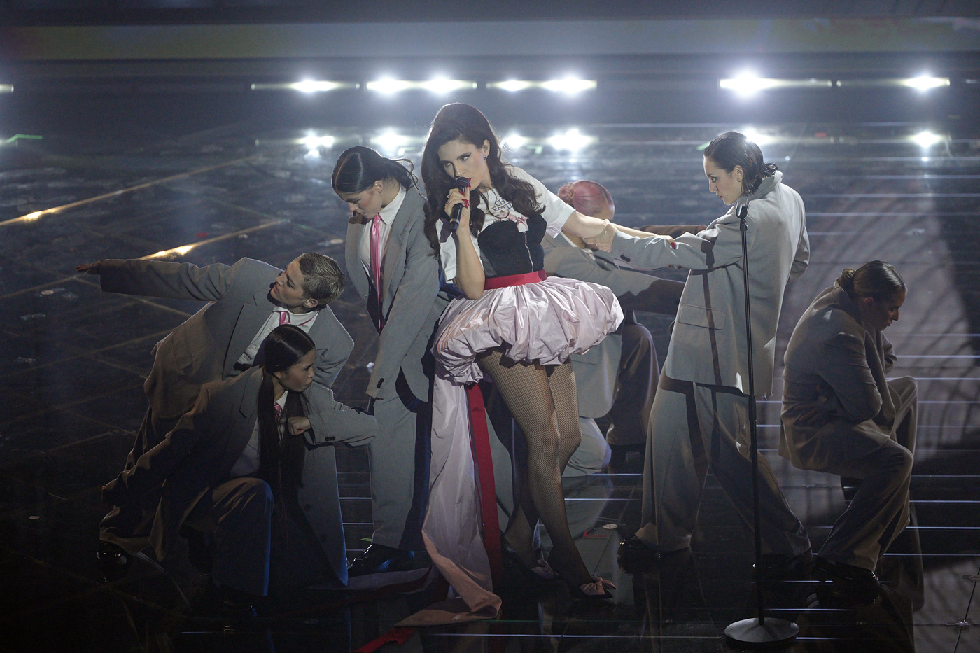 Ditonellapiaga rifiuta il classico vestito austero sanremese, rivisitandolo con un tono punk bon-ton. La gonna è corta e lo strascico è inesistente ad eccezione di un lungo fiocco. Sotto il corpetto spunta una t-shirt bianca, un look rivoluzionario rispetto agli standard del Festival che porta il nome di Dsquared2.