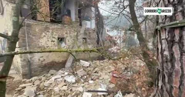 Il sopralluogo del Corriere di Arezzo al Matto, frazione di Arezzo, dove una casa è esplosa. Tre feriti. Coinvolti anche tre cani. Area transennata, strada invasa da pietre e detriti.