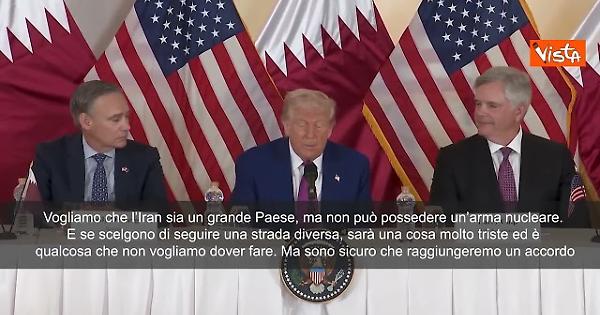 “Vogliamo che l’Iran sia un grande Paese, ma non può possedere un’arma nucleare. E se scelgono di seguire una strada diversa, sarà una cosa molto triste ed è qualcosa che non vogliamo dover fare. Ma sono sicuro che raggiungeremo un accordo”. Lo ha detto il Presidente degli Stati Uniti Donald Trump durante la sua visita in Qatar.