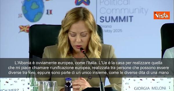 "L'Albania è ovviamente europea, come l'Italia, la Serbia, la Norvegia, al di là se siano parte di questa o quella organizzazione. L'Ue è la casa per realizzare quella che mi piace chiamare riunificazione europea, realizzata tra persone che possono essere diverse tra loro, eppure sono parte di un unico insieme, come le diverse dita di una mano". Lo ha detto il premier Giorgia Meloni parlando alla sessione plenaria del summit della Comunità politica europea a Tirana.