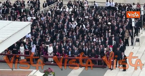 La Presidente della Commissiome Europea Ursula Von der Leyen la Regina Letizia di Spagna si scambiano il segno della pace durante la messa di insediamento di Papa Leone XIV, le immagini