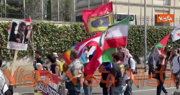 Durante la manifestazione per la pace che si è tenuta a Roma hanno sfilato anche bandiere dell'Iran e della Russia.