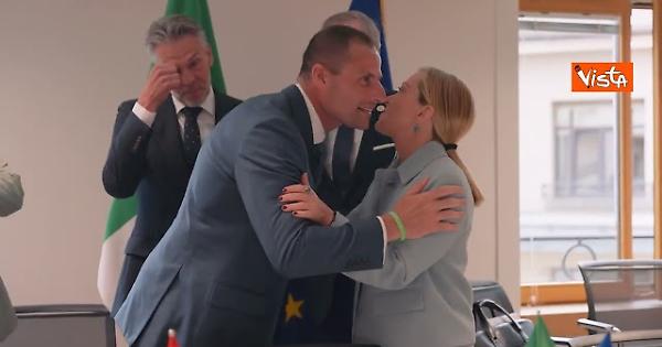 La Presidente del Consiglio Giorgia Meloni arriva con un abito celeste al Consiglio europeo del 26 e 27 giugno.