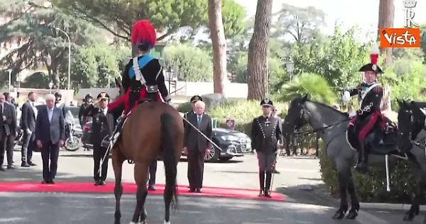 Mattarella fa visita alla Scuola Ufficiali Carabinieri di Roma per la cerimonia del 20° anniversario di costituzione del Centro di eccellenza per le Unità di polizia di stabilità e viene accolto da Briciola, la cagnolina mascotte dei carabinieri.