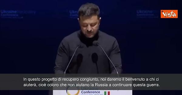 "Vorrei sottolineare un punto molto importante. In questo progetto di recupero congiunto, noi daremo il benvenuto a chi ci aiuterà, cioè coloro che non aiutano la Russia a continuare questa guerra. Sappiate che solamente gli amici sono invitati a far parte della ripresa tecnologica, industriale ed economica dell'Ucraina. Solo gli amici" così il Presidente dell'Ucraina Volodymyr Zelensky, intervenendo in apertura alla Conferenza sulla Ricostruzione dell'Ucraina alla Nuvola di Fuksas a Roma.