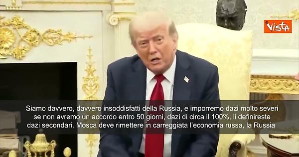 Il Presidente Usa Donald Trump minaccia di imporre “dazi molto pesanti” agli alleati della Russia se non si raggiungerà un accordo sulla guerra in Ucraina “entro 50 giorni”. “Siamo molto scontenti, io lo sono, della Russia”, ha dichiarato il presidente degli Stati Uniti alla Casa Bianca, insieme al Segretario Generale della Nato Mark Rutte, aggiungendo che “di conseguenza, applicheremo dazi secondari”, ovvero a chi commercia con Mosca. “Imporremo dazi molto severi se non raggiungeremo un accordo entro 50 giorni. Dazi pari a circa il 100%”, ha aggiunto.