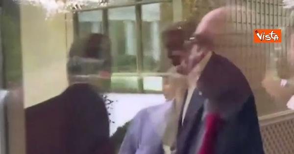 Il Presidente degli Stati Uniti Donald Trump, prima dell'incontro con la stampa, entrando alla Casa Bianca, apre e tiene aperta la porta per il suo agente dei servizi segreti.