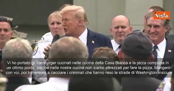 "Vi ho portato gli hamburger cucinati nelle cucine della Casa Bianca e la pizza comprata in un ottimo posto, perché nelle nostre cucine non siamo attrezzati per fare la pizza. Mangerò con voi, poi torneremo a cacciare i criminali che hanno reso le strade di Washington insicure", così Donald Trump tra gli uomini della Guardia Nazionale al lavoro per la sicurezza delle strade di Washington.