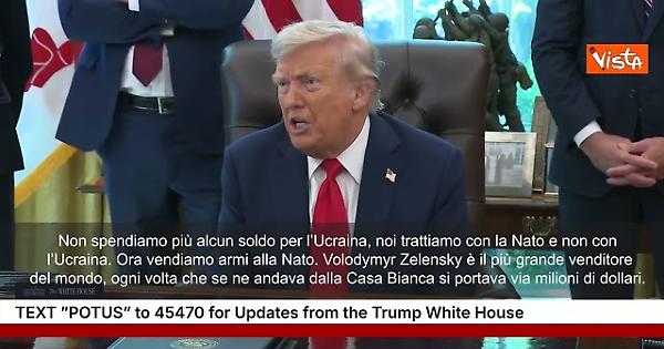 (Agenzia Vista) Usa, 25 agosto 2025 "Non spendiamo più alcun soldo per l’Ucraina, noi trattiamo con la Nato e non con l’Ucraina. Ora vendiamo armi alla Nato. Volodymyr Zelensky è il più grande venditore del mondo, ogni volta che se ne andava dalla Casa Bianca si portava via milioni di dollari”. Lo ha detto il Presidente Usa Donald Trump parlando con i cronisti nello Studio Ovale della Casa Bianca. WhiteHouse Fonte: Agenzia Vista / Alexander Jakhnagiev