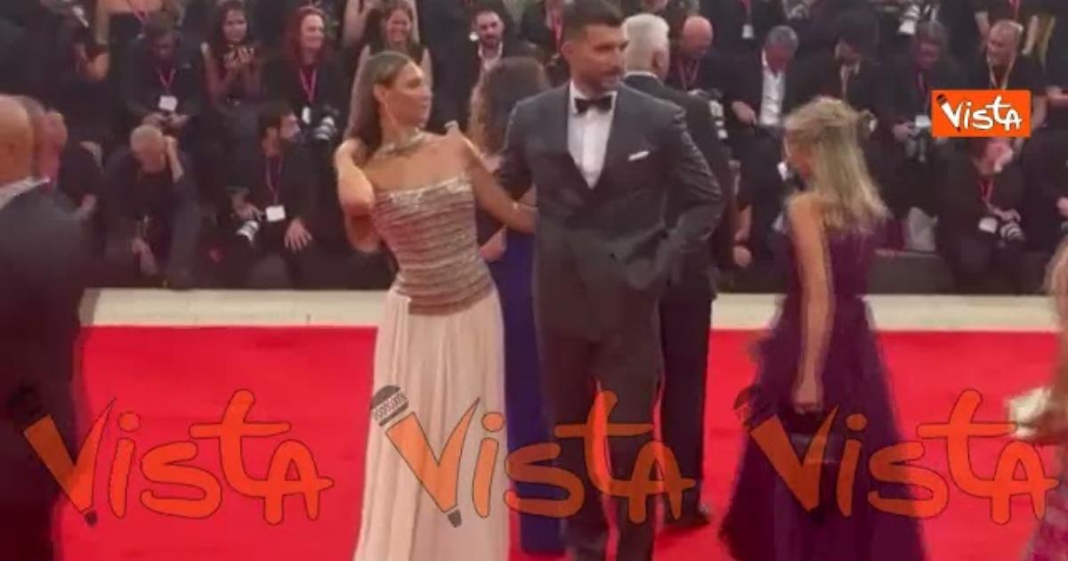 Beatrice Valli elegantissima in un abito bianco con dettagli argentati sfila sul red carpet dell'82esima Mostra del Cinema di Venezia accompagnata dal marito Marco Fantini