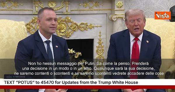 "Non ho nessun messaggio per Putin. Sa come la penso. Prenderà una decisione in un modo o in un altro. Qualunque sarà la sua decisione, ne saremo contenti o scontenti e se saremo scontenti vedrete accadere delle cose". Lo ha detto Donald Trump parlando con i cronisti alla Casa Bianca.