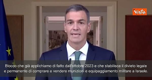 "Il Governo di Spagna ha deciso di fare un ulteriore passo e di mettere immediatamente in atto azioni aggiuntive per fermare l’aggressione a Gaza, perseguire i suoi esecutori e sostenere la popolazione palestinese. Azioni che desidero condividere con tutti voi. La prima è l’approvazione urgente di un decreto-legge reale che consolidi giuridicamente il blocco del transito di armi verso Israele che già applichiamo di fatto dall’ottobre 2023 e che stabilisca il divieto legale e permanente di comprare e vendere munizioni e equipaggiamento militare a Israele. In secondo luogo, insieme a questo embargo, il divieto di transito, da parte della Spagna o attraverso i porti spagnoli, delle navi che trasportano combustibili destinati alle Forze Armate israeliane" così il primo ministro spagnolo Pedro Sànchez in un messaggio alla sua nazione.