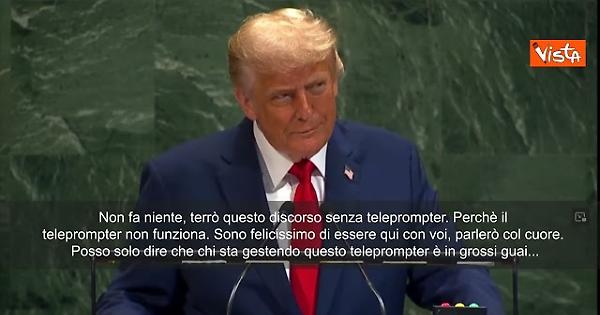 "Non fa niente, terrò questo discorso senza teleprompter. Perchè il teleprompter non funziona. Sono felicissimo di essere qui con voi, parlerò col cuore. Posso solo dire che chi sta gestendo questo teleprompter è in grossi guai...", scherza così il Presidente degli Stati Uniti Donald Trump nel suo discorso all'assemblea dell'Onu.