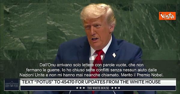 “Dall'Onu arrivano solo lettere con parole vuote, che non fermano le guerre. Io ho chiuso sette conflitti senza nessun aiuto dalle Nazioni Unite e non mi hanno mai neanche chiamato. Merito il Premio Nobel”, lo ha detto il Presidente Usa Donald Trump all'assemblea Onu a New York.
