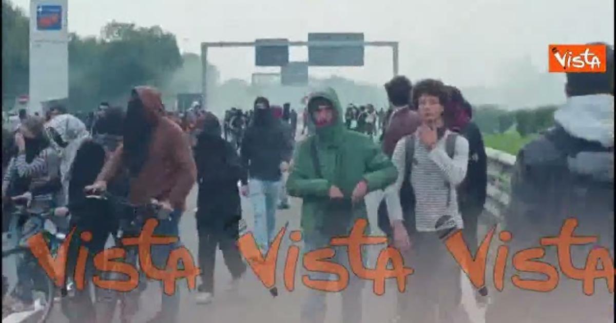 Il corteo pro Gaza di Milano è arrivato sulla Tangenziale Est. I manifestanti hanno imbrattato i cartelli stradali e lanciato bombe carta contro la Polizia, che ha risposto con i lacrimogeni.