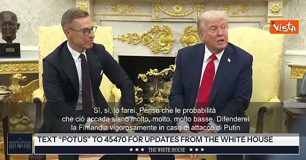 "Sì, sì, lo farei. Penso che le probabilità che ciò accada siano molto, molto, molto basse. Difenderei la Finlandia vigorosamente in caso di attacco di Putin", lo ha detto il Presidente usa Donald Trump ricevendo il premier finlandese Stubb alla Casa Bianca.