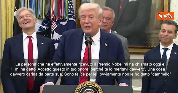 (Agenzia Vista) Usa, 11 ottobre 2025 "La persona che ha effettivamente ricevuto il Premio Nobel mi ha chiamato oggi e mi ha detto 'Accetto questo in tuo onore, perché te lo meritavi davvero'. Una cosa davvero carina da parte sua. Sono felice per lei, ovviamente non le ho detto “dammelo”'." Lo ha detto Trump alla Casa Bianca. White House Fonte: Agenzia Vista / Alexander Jakhnagiev