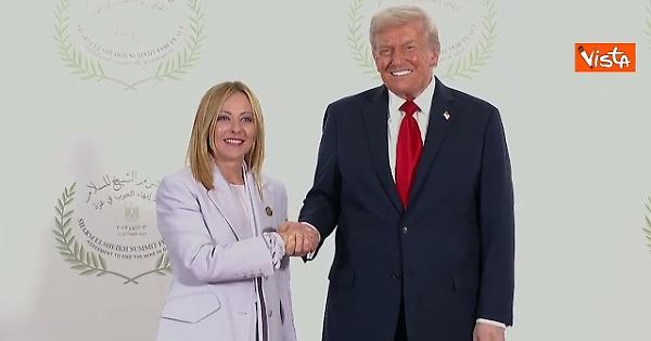 La premier Giorgia Meloni in Egitto per la firma degli accordi di pace per Gaza, ecco la stretta di mano con il Presidente Usa Donald Trump.