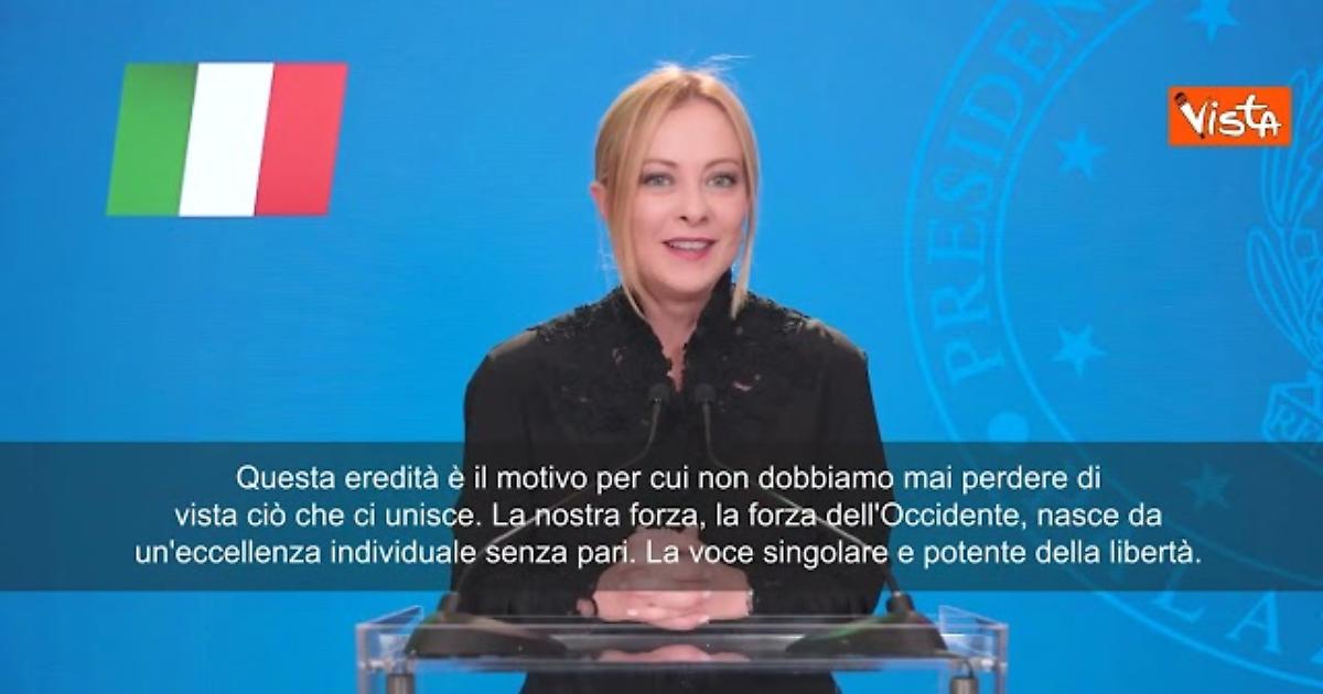 "La nostra forza, la forza dell'Occidente, nasce da un'eccellenza individuale senza pari. La voce singolare e potente della libertà. Ma essa si perfeziona solo quando l'intera orchestra suona insieme in un'armonia impeccabile e potente. Questa eredità è il motivo per cui non dobbiamo mai perdere di vista ciò che ci unisce. La nostra forza, la forza dell'Occidente, nasce da un'eccellenza individuale senza pari. La voce singolare e potente della libertà. Ma essa si perfeziona solo quando l'intera orchestra suona insieme in un'armonia impeccabile e potente. Questa eredità è il motivo per cui non dobbiamo mai perdere di vista ciò che ci unisce". Così la premier Giorgia Meloni, nel videomessaggio inviato in occasione del 50esimo anniversario della Niaf, la National Italian American Foundation.