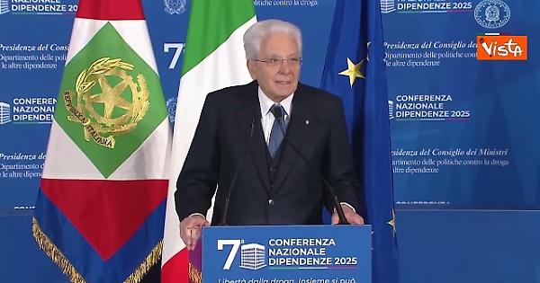 (Agenzia Vista) Roma, 08 novembre 2025 "Infrango solo per pochi istanti il programma protocollare per esprimere l'apprezzamento per la convocazione della conferenza e per le modalità del suo svolgimento, l'accurata e anche lunga preparazione ha consentito di raccogliere esperienze, riflessioni, opinioni, proposte da riversare poi nei lavori di questi due giorni. La tragedia delle dipendenze, la tragedia delle vite distrutte della perversa presenza della criminalità organizzata richiede un impegno consapevole, un impegno costante nella determinazione, richiede anche un impegno corale. Nessuno si troverà solo perché l'impegno per combattere la droga è un fronte di libertà", lo ha detto il Presidente della Repubblica Sergio Mattarella alla VII Conferenza nazionale sulle dipendenze. Chigi Fonte: Agenzia Vista / Alexander Jakhnagiev
