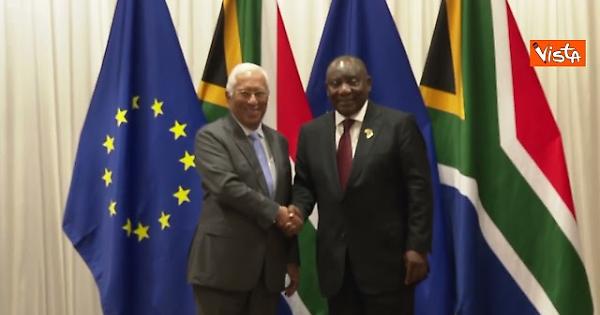 António Costa, Presidente del Consiglio europeo, e Ursula von der Leyen, Presidente della Commissione europea, incontrano Cyril Ramaphosa, Presidente del Sudafrica a Johannesburg per il G20 Sudafrica. Eccoli posare per la foto di rito.