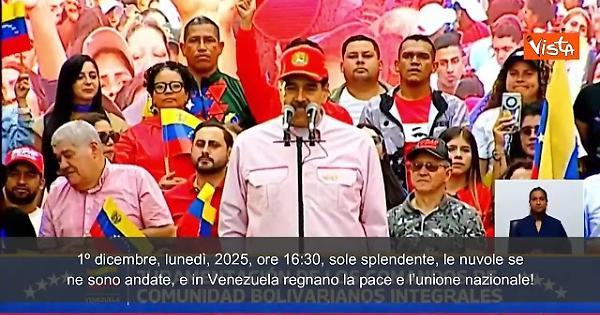Salendo sul palco a Caracas, il presidente del Venezuela Maduro ha aperto il suo intervento citando la famosa canzone degli Inti-Illimani "El pueblo unido jamas serà vencido". Poi ha aggiunto: "Primo dicembre, lunedì, 2025, ore 16:30, sole splendente, le nuvole se ne sono andate, e in Venezuela regnano la pace e l’unione nazionale! Pace e unione! La pace, le unioni e i sovrani! Nella Repubblica Bolivariana del Venezuela regnano la pace, l’unione e la vittoria per sempre!".