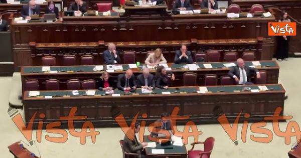 La premier Meloni prende appunti durante l'intervento di Conte in Aula alla Camera sul Consiglio Ue.