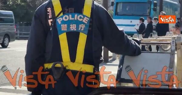 La Polizia giapponese sposta le barriere mobili tradizionalmente a mano per far entrare le auto al Kantai, sede del Governo giapponese, in occasione della visita della premier Meloni.