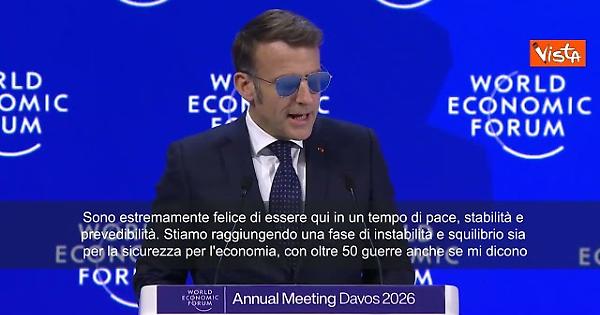 “Sono estremamente felice di essere qui in un tempo di pace, stabilità e prevedibilità. Stiamo raggiungendo una fase di instabilità e squilibrio sia per la sicurezza per l'economia, con oltre 50 guerre anche se mi dicono che alcune sono risolte e un passaggio verso un mondo senza regole dove la legge internazionale è calpestata e le ambizioni imperiali tornano alla superficie. I nuovi dazi sono inaccettabili soprattutto se usati come leva contro la sovranità territoriale”. Così il presidente francese, Emmanuel Macron, ha ironizzato all'inizio del suo intervento al forum di Davos, in Svizzera.