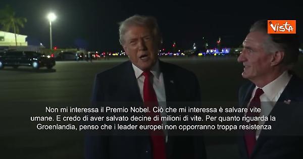 “Non mi interessa il Premio Nobel. Ciò che mi interessa è salvare vite umane. E credo di aver salvato decine di milioni di vite. Per quanto riguarda la Groenlandia, penso che i leader europei non opporranno troppa resistenza”. Così il Presidente Usa Donald Trump, in partenza da Miami per il Forum economico mondiale di Davos, in Svizzera.