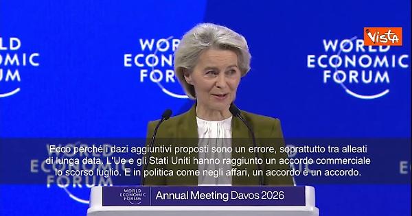 “Consideriamo il popolo degli Usa non solo come nostri alleati, ma come amici. Trascinarci in una pericolosa spirale discendente finirebbe solo per aiutare gli stessi avversari che entrambi siamo impegnati a tenere fuori dal nostro orizzonte strategico. Ecco perché i dazi aggiuntivi proposti sono un errore, soprattutto tra alleati di lunga data. L'Ue e gli Stati Uniti hanno raggiunto un accordo commerciale lo scorso luglio. E in politica come negli affari, un accordo è un accordo. E quando gli amici si stringono la mano, deve pur significare qualcosa". Lo ha detto la presidente della Commissione europea, Ursula von der Leyen, a Davos.