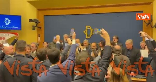 I deputati del Pd, M5S e Avs hanno occupato la sala stampa di Montecitorio per impedire la conferenza stampa sulla remigrazione. I parlamentari hanno intonato Bella ciao.