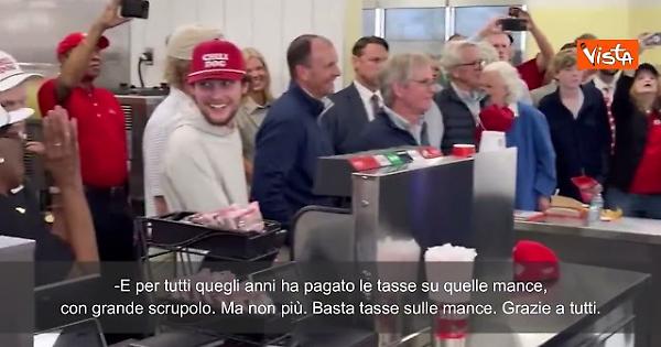 "Niente tasse sulle mance. Niente tasse sugli straordinari. Vi interessa?. Lei lavora qui da quasi cinquant’anni. E per tutti quegli anni ha pagato le tasse su quelle mance, con grande scrupolo. Ma non più. Basta tasse sulle mance. Grazie a tutti. Grazie. Grazie a tutti. Grazie a tutti" così il presidente Trump visitando un fast food di Rome, in Georgia.