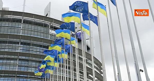 Nel giorno del quarto anniversario dall'inizio dell'invasione russa, bandiere ucraine sono state issate davanti alla sede del Parlamento Europeo a Strasburgo.