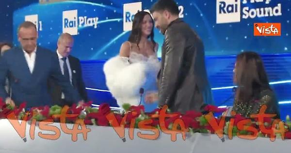 Carlo Conti aspetta con i fiori Irina Shayk, che arriva in conferenza stampa.