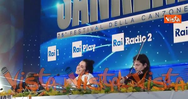 Levante canta il ritornello della sua canzone al termine della conferenza stampa a Sanremo.