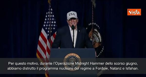 "L’Iran è il principale Stato sponsor del terrorismo nel mondo e, solo di recente, ha ucciso decine di migliaia dei propri cittadini scesi in piazza a protestare. È sempre stata politica degli Stati Uniti, e in particolare della mia amministrazione, che questo regime terroristico non possa mai possedere un’arma nucleare. Lo ripeto: non possono mai avere un’arma nucleare. Per questo motivo, durante l’Operazione Midnight Hammer dello scorso giugno, abbiamo distrutto il programma nucleare del regime a Fordow, Natanz e Isfahan. Dopo quell’attacco, li abbiamo avvertiti di non riprendere mai più la loro maligna ricerca di armi nucleari e abbiamo cercato ripetutamente di raggiungere un accordo. Ci abbiamo provato. Volevano farlo. Non volevano farlo. Di nuovo, volevano farlo. Non volevano farlo. Non sapevano cosa stesse accadendo. Volevano soltanto praticare il male. Ma l’Iran ha rifiutato, proprio come ha fatto per decenni e decenni. Ha respinto ogni opportunità di rinunciare alle proprie ambizioni nucleari, e noi non possiamo più tollerarlo. Al contrario, ha tentato di ricostruire il proprio programma nucleare e di continuare a sviluppare missili a lungo raggio che ora possono minacciare i nostri ottimi amici e alleati in Europa, le nostre truppe stanziate all’estero e che presto potrebbero raggiungere il territorio americano" così il presode Trump.