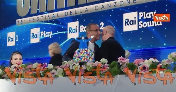 Carlo Conti viene premiato dalla famiglia Vacchino nella sua ultima conferenza stampa e coglie l'occasione per ringraziare Bruno il pescatore.
