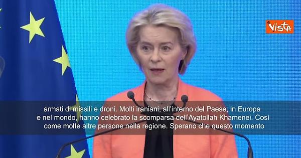 “Non si dovrebbero versare lacrime per il regime iraniano che ha inflitto morte e imposto la repressione al suo stesso popolo. E questo ha causato devastazione e destabilizzazione in tutta la regione attraverso i suoi rappresentanti armati di missili e droni. Molti iraniani, all’interno del Paese, in Europa e nel mondo, hanno celebrato la scomparsa dell’Ayatollah Khamenei. Così come molte altre persone nella regione. Sperano che questo momento possa aprire la strada verso un Iran libero. Il popolo iraniano merita libertà, dignità e il diritto di decidere del proprio futuro, anche se sappiamo che sarà pieno di pericoli e instabilità durante e dopo la guerra”. Lo ha detto la presidente della Commissione europea, Ursula von der Leyen, alla Conferenza degli ambasciatori dell’Ue.