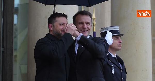 Il Presidente francese Macron riceve il su omologo ucraino Zelensky all'Eliseo, a Parigi.