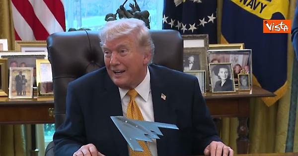 Il Presidente Usa Donald Trump mostra il modellino del Bombardiere B-2 Spirit ai giornalisti nello Studio Ovale della Casa Bianca.