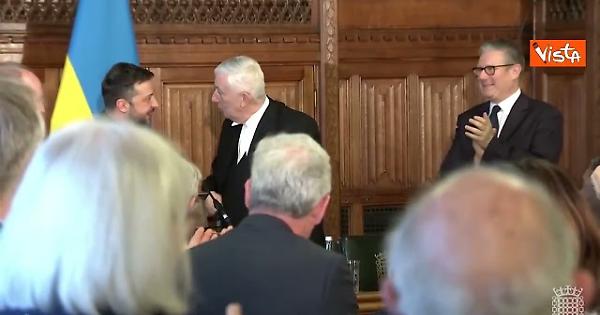 La standing ovation per il Presidente ucraino Zelensky al termine del suo intervento al Parlamento del Regno Unito a Londra.