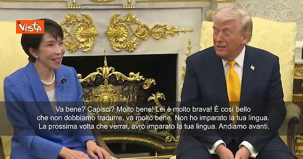"Va bene? Capisci? Molto bene! Lei è molto brava! È così bello che non dobbiamo tradurre, va molto bene. Non ho imparato la tua lingua. La prossima volta che verrai, avrò imparato la tua lingua. Andiamo avanti", così Trump scherza con la premier giapponese Takaichi alla Casa Bianca.