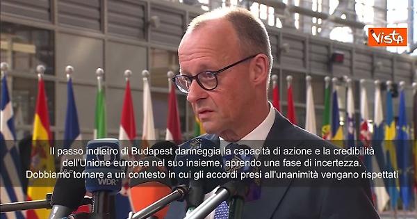 “Orban ha disatteso un impegno preso all'unanimità, contravvenendo a uno dei principi fondamentali della cooperazione europea. L'Unione si fonda anche sulla fiducia reciproca e sulla possibilità di fare affidamento sulle decisioni condivise. Il passo indietro di Budapest danneggia la capacità di azione e la credibilità dell'Unione europea nel suo insieme, aprendo una fase di incertezza. Dobbiamo tornare a un contesto in cui gli accordi presi all'unanimità vengano rispettati”, lo ha detto il Cancelliere tedesco, Friedrich Merz, al Consiglio europeo a Bruxelles.