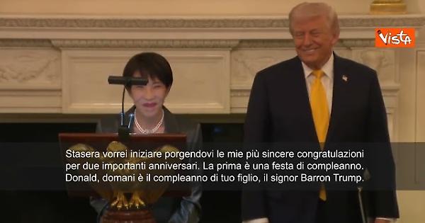 “Stasera vorrei iniziare porgendovi le mie più sincere congratulazioni per due importanti anniversari. La prima è una festa di compleanno. Donald, domani è il compleanno di tuo figlio, il signor Barron Trump. So che è cresciuto così tanto da diventare un gentiluomo molto alto e di bell'aspetto. È molto chiaro da chi ha preso, ovviamente, dai suoi genitori. Non c'è dubbio. Allora Donald, se posso chiederglielo, gli faccia i miei più sinceri auguri di buon compleanno”, così la premier giapponese Takaichi alla Casa Bianca.