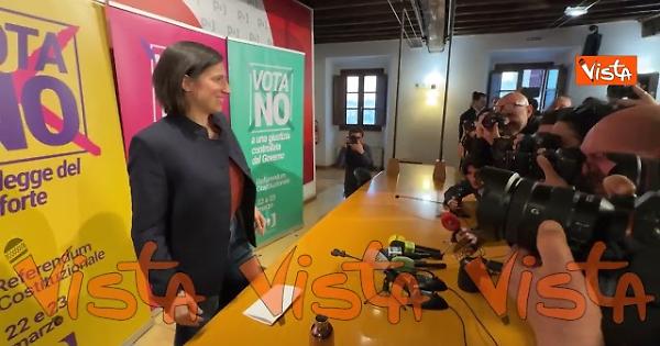 Applausi e strette di mano per la segretaria del Pd al suo arrivo in conferenza stampa sulla vittoria al Referendum. La conferenza stampa della segretaria del Pd Elly Schlein dalla sede del Nazareno a Roma dopo i risultati del Referendum sulla giustizia.