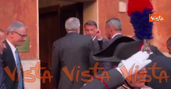 Il Presidente francese arriva alla sede di Sant'Egidio per un colloquio con i responsabili della Comunità, tra cui il Presidente Marco Impagliazzo e il fondatore Andrea Riccardi. Macron entrando saluta i curiosi in strada lanciando baci.