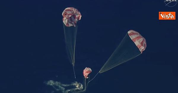 L'ammaraggio nell'oceano Pacifico. Reid Wiseman, Victor Glover, Christina Koch e il canadese Jeremy Hansen sono tornati a casa dopo 10 giorni di volo.
